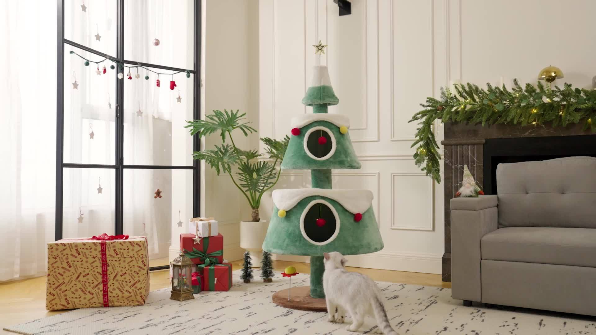 2-Tier Christmas Cat Tree with Plush Ball & Star - Festive Green & White Design, Cat House & Toy for Indoor Cats, Perfect for Holiday Decor, Indoor Cat Furniture | Festive Cat Tree | Star-Topped Tree, Cat Toys