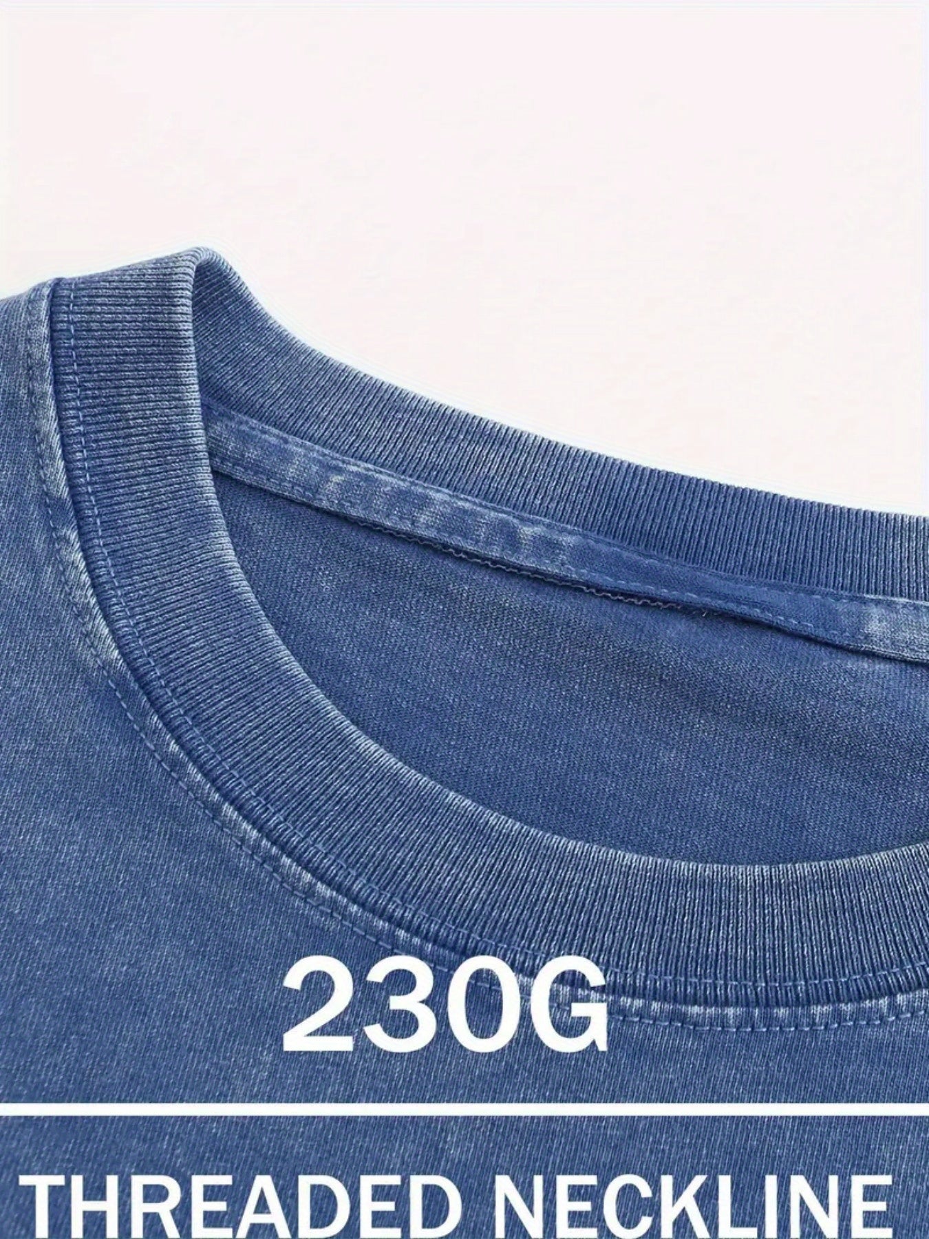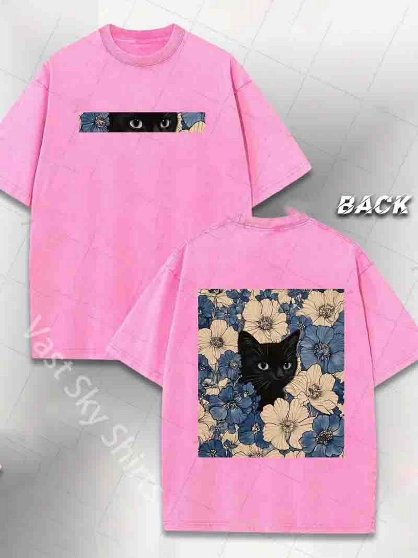 Men'S Casual Street Style T-Shirt, 230G Double-Sided Washed Fabric, Black Cat & Floral Print, Round Neck, Regular Fit, Short Sleeve, All-Season Outdoor Tee, Classic Gift for Hiking & Daily Wear, Hiking Apparel | Street Style