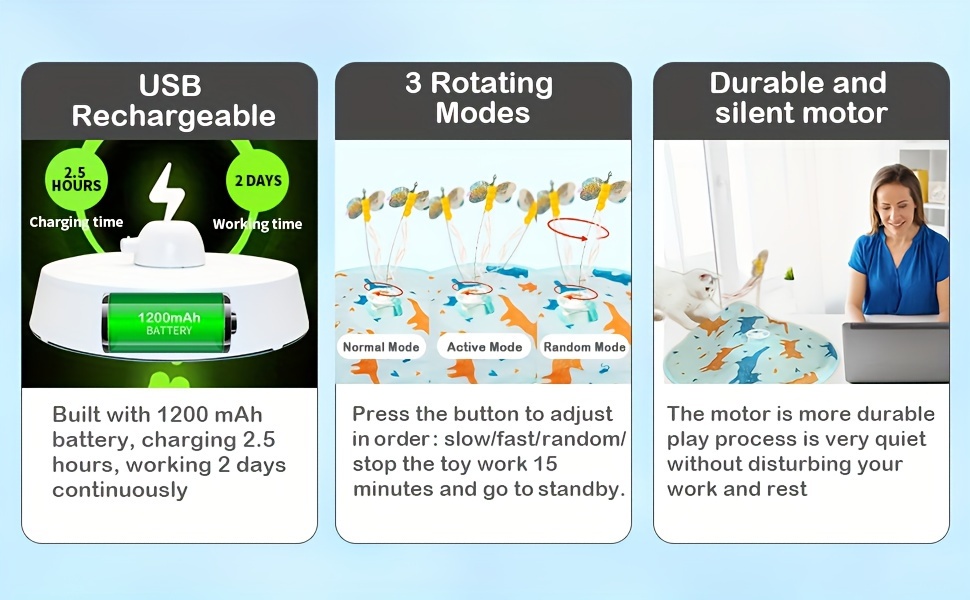 【3 Rotating Modes】Three rotation modes, multi-track irregular movement, increase the curiosity and interest of cats. Press the button to adjust in order: slow/fast/random/stop; And it will automatically shut down after 15 minutes of working and go to standby; not only energy saving, but also to avoid excessive stimulation and overwork of the cat.