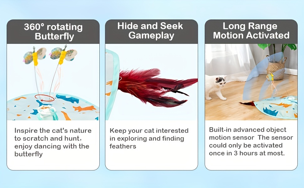 【2 in 1 Interactive Cat Toys】360° rotating Butterfly: Attract your cats to busy for catch whole day, Cats can play with toys in sight and enjoy themselves. Hide and Seek Gameplay: Keep your cat interested in exploring and finding feathers,More ways to play allows your cat to get lots of training to avoid obesity.